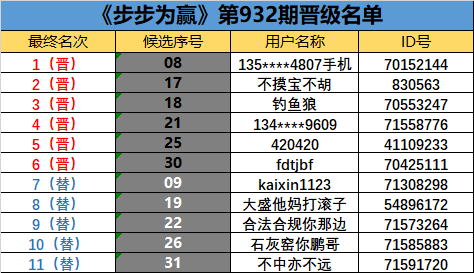 《步步为赢》第932期晋级名单公布