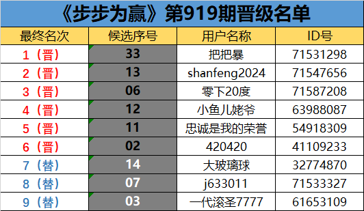 《步步为赢》第919期晋级名单公布