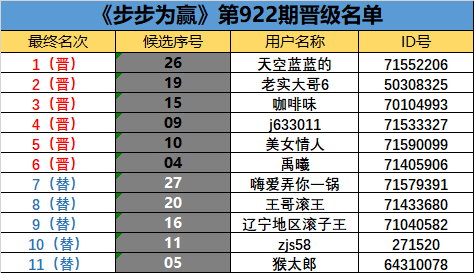 《步步为赢》第922期晋级名单公布