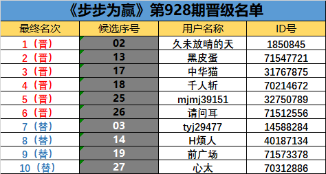 《步步为赢》第928期晋级名单公布